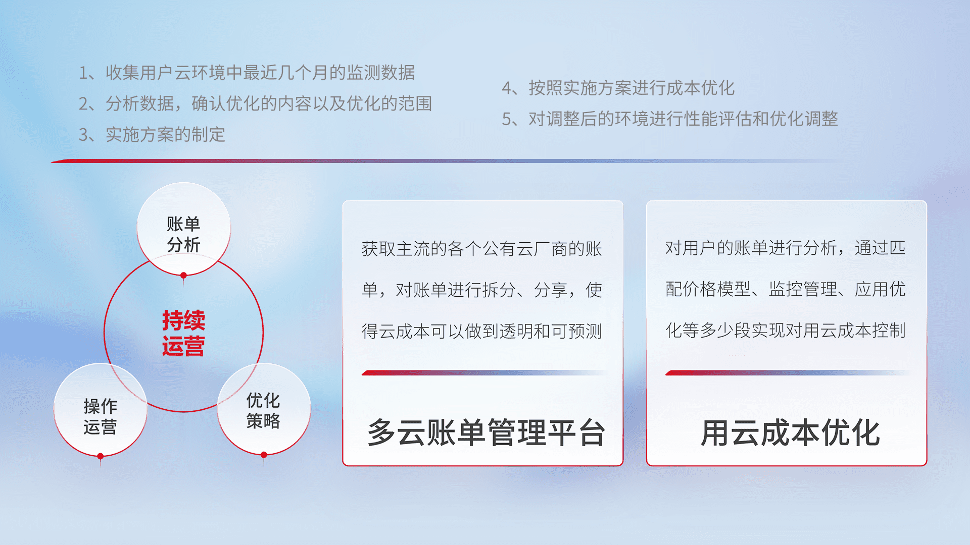 通过多云纳管,,,,以统一的资源数据模型把客户的云资源进行抽象和封装,,,进而实现对多云资源的统一操作,,保障云资源管理的可靠性、、稳定性与可用性。。量身定制化运维内容,,,,配置、、、、开发运维、、补丁管理、、、、备份、、、监控、、认证和访问管理、、、、审计和日常巡检等,,,,保障在用云过程中的可靠度,,稳定度以及高可用率。。。